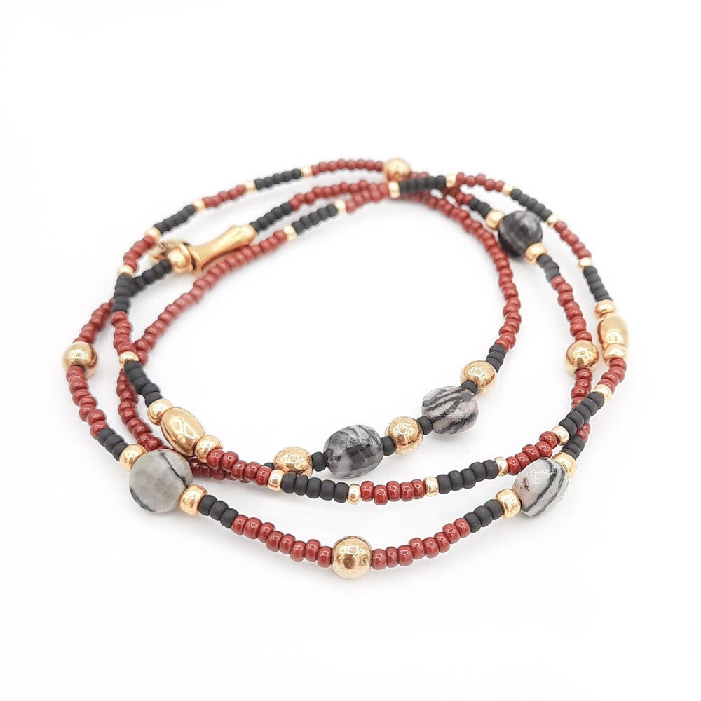 De armband gaat 3 maal om de pols en door zijn lengte ook te gebruiken als ketting.