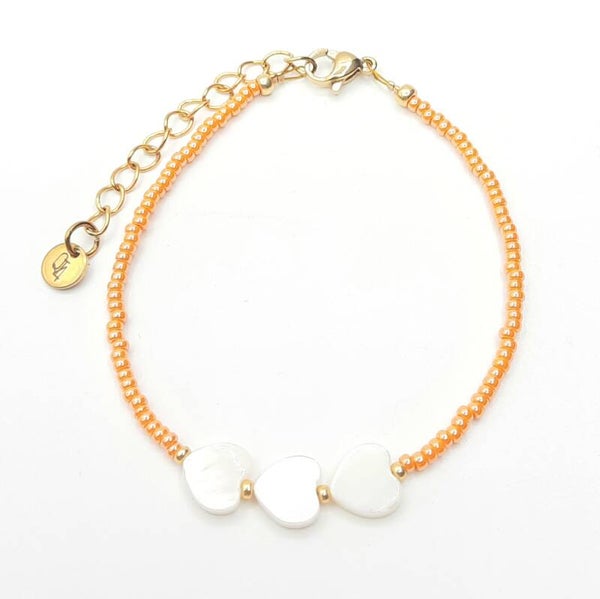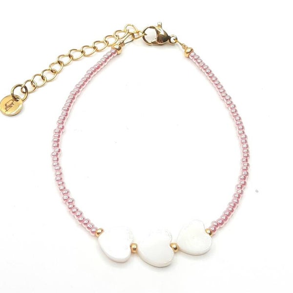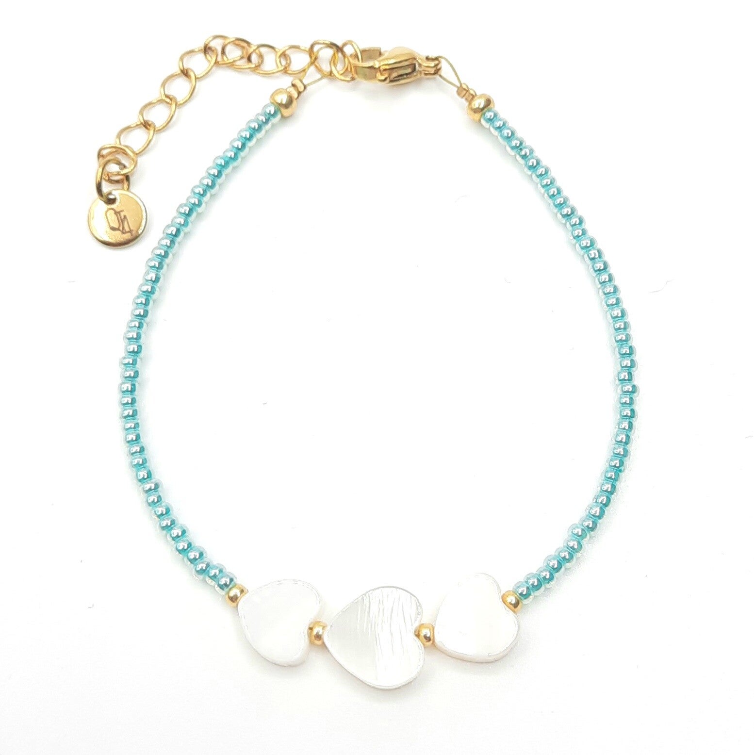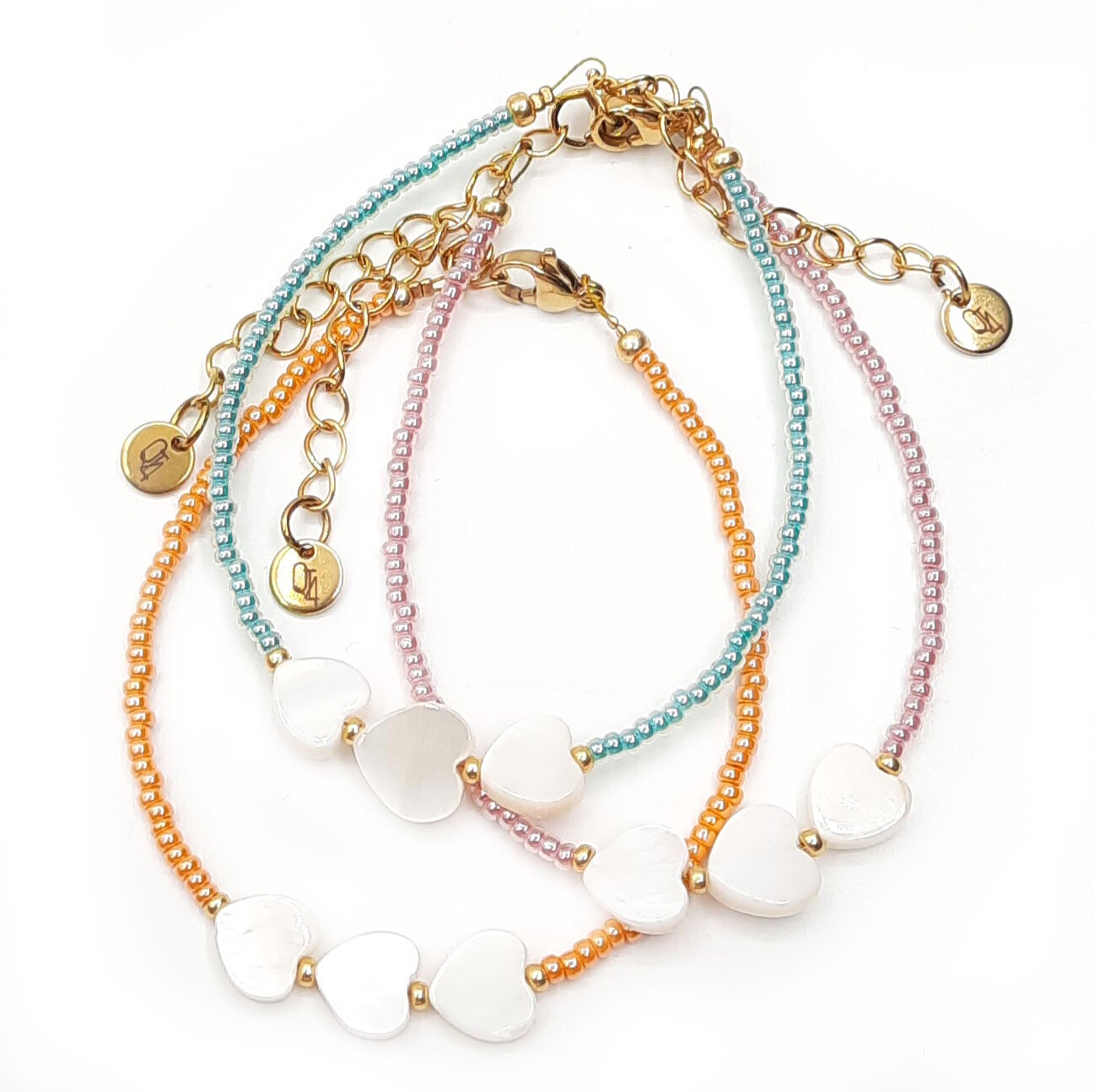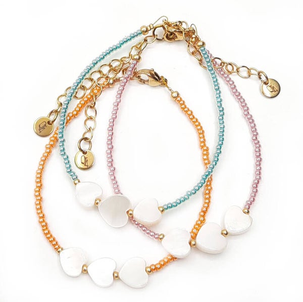 Elke armband is zorgvuldig met de hand geregen en gemaakt van hoogwaardige Japanse Miyuki glaskralen van 2mm, bekend om hun perfecte vorm en prachtige glans. In het midden schitteren 3 hartjes (8mm) van natuurlijke schelp, omlijst door fijne details in goudkleurig roestvrij staal(RVS) – sterk, duurzaam en allergievriendelijk.