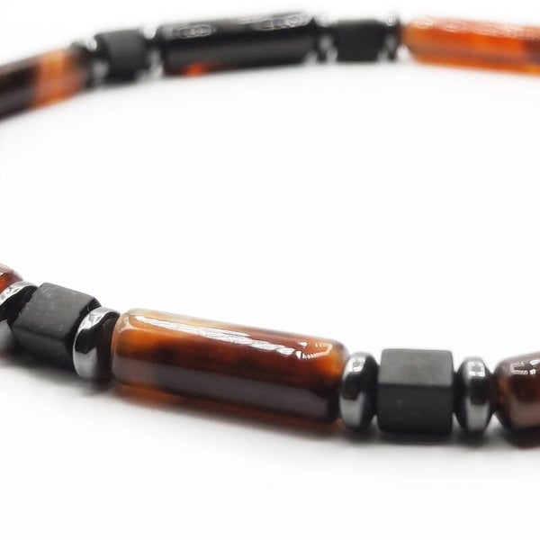 Een natuurstenen armband  met 13 mm tube natuursteen kralen in combinatie met hematite spacerbeads, Miuyki glaskralen en afgewerkt met een rvs kraal.