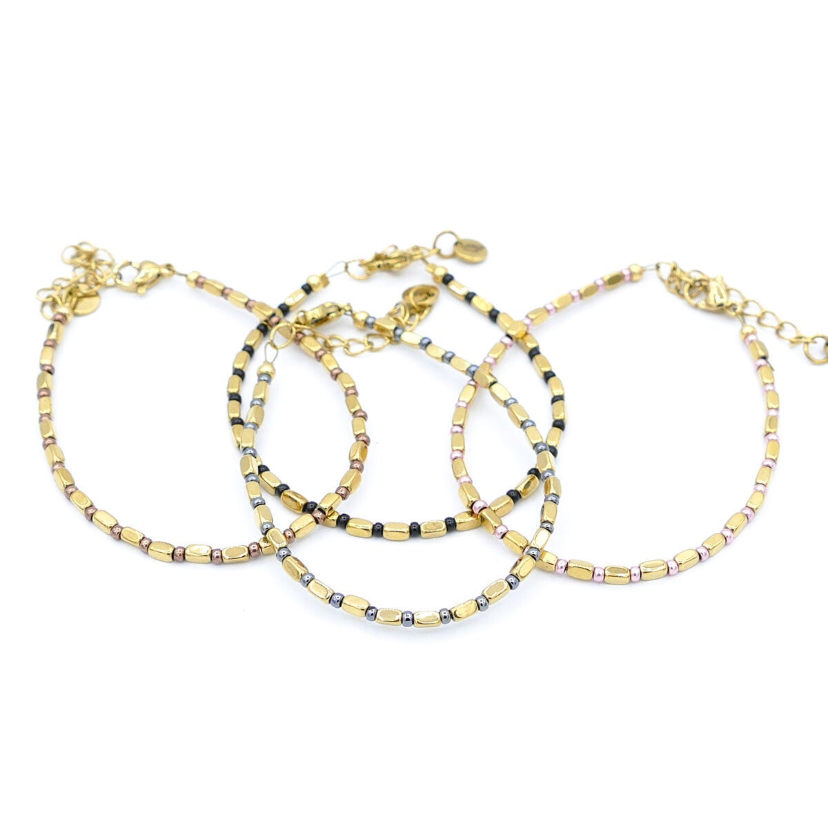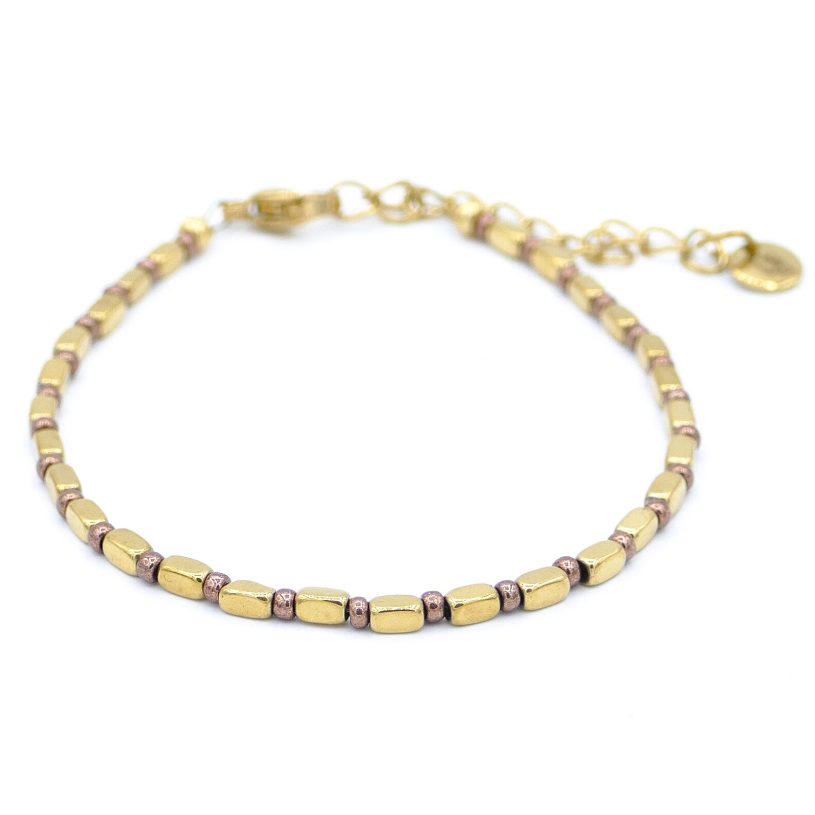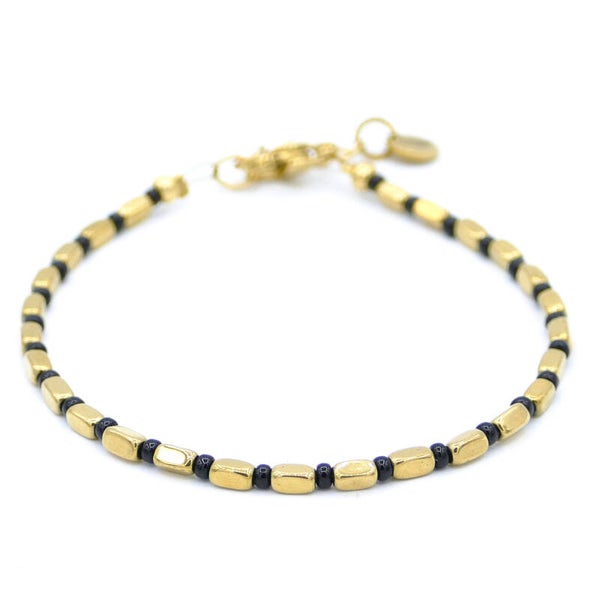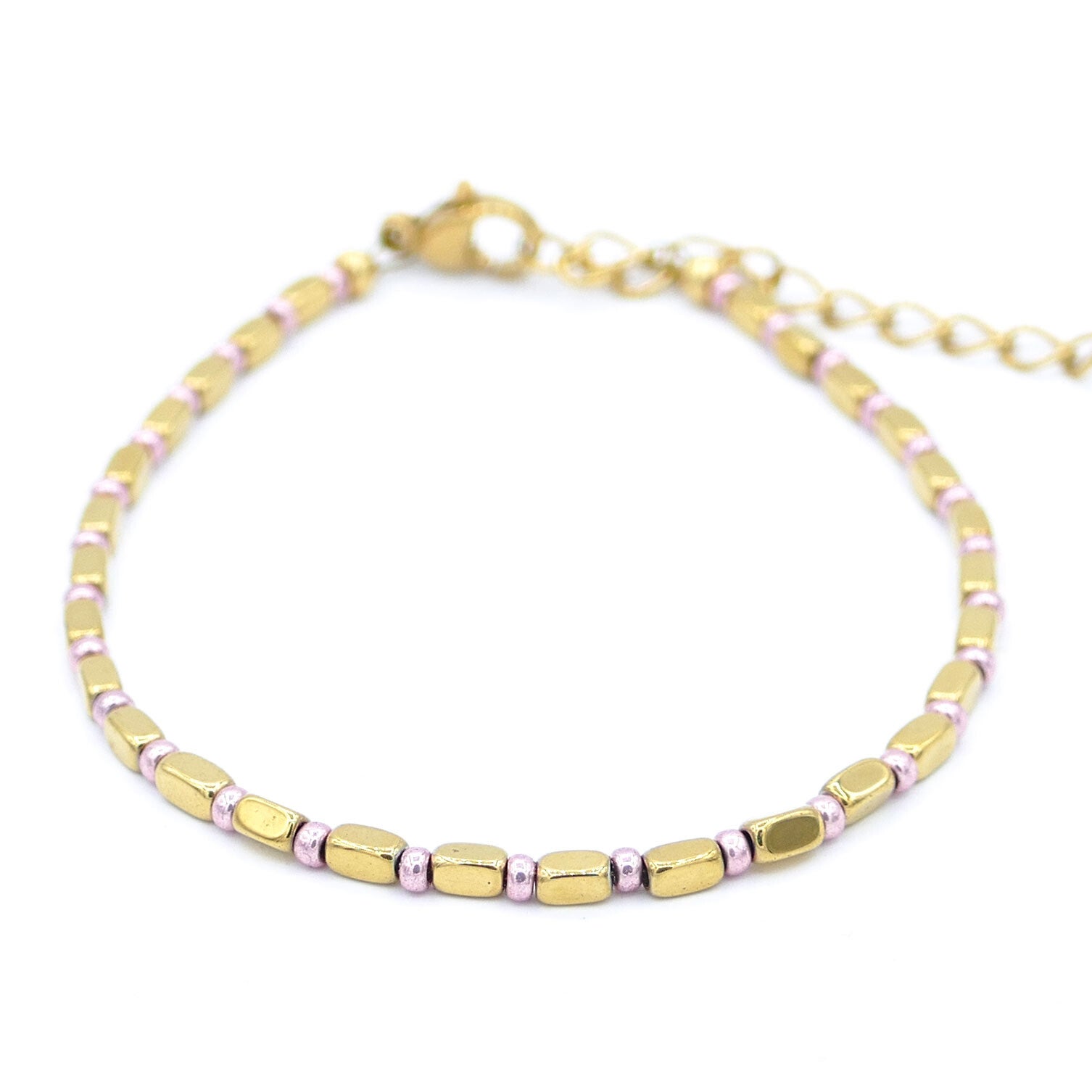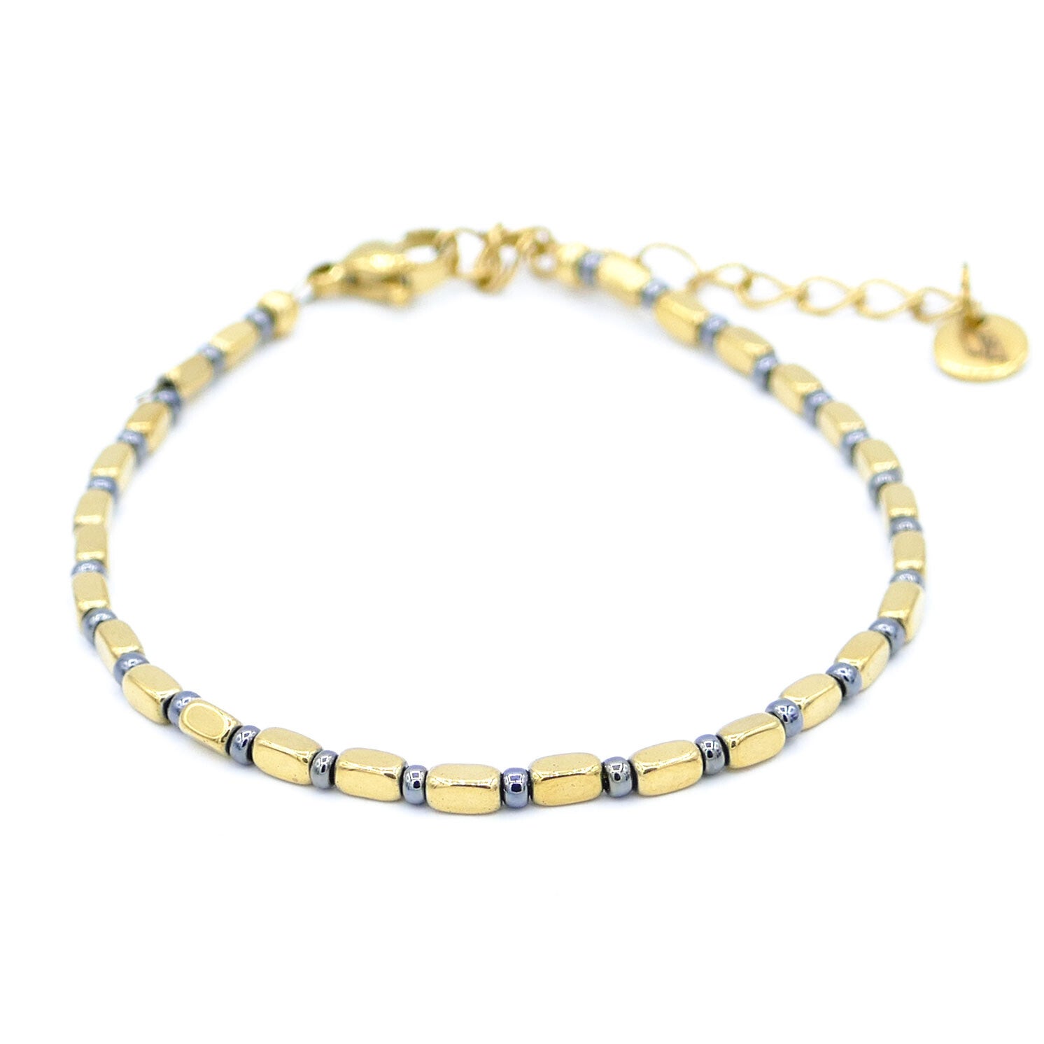 Het armbandje is gemaakt van Hematite 2x4mm Hematite en Miyuki 2mm glaskraaltjes. Afgwerkt met een rvs sluiting en verlengkettnkje.