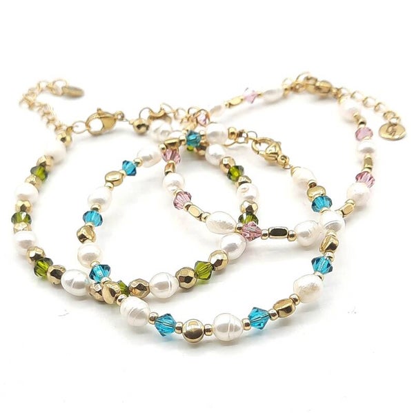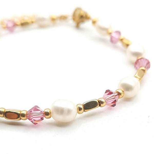 Het armbandje is gemaakt met zoetwaterparels, strass, hematite en japanse Miyuki glaskralen.