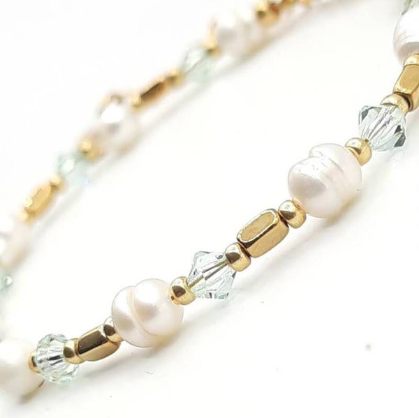 Het armbandje is gemaakt met zoetwaterparels, strass, hematite en japanse Miyuki glaskralen.
