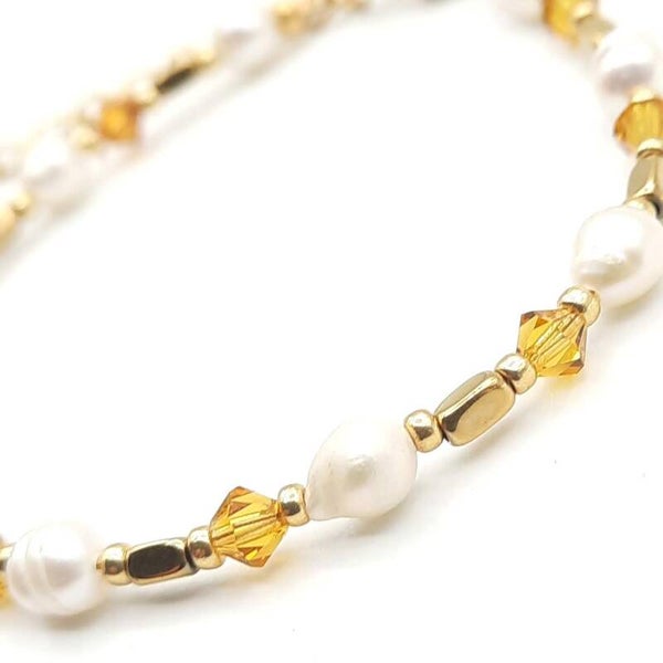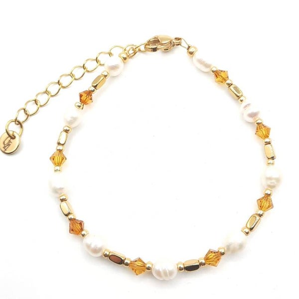 Het armbandje is gemaakt met zoetwaterparels, strass, hematite en japanse Miyuki glaskralen.