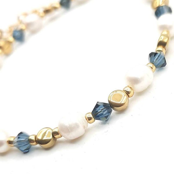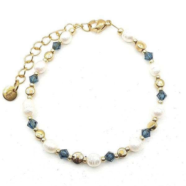 Het armbandje is gemaakt met zoetwaterparels, strass, hematite en japanse Miyuki glaskralen.