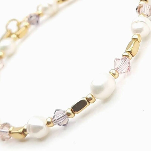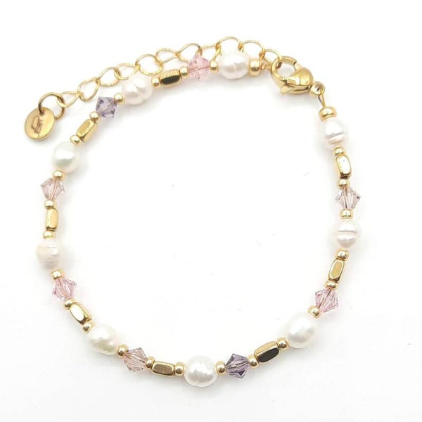 Het armbandje is gemaakt met zoetwaterparels, strass, hematite en japanse Miyuki glaskralen.