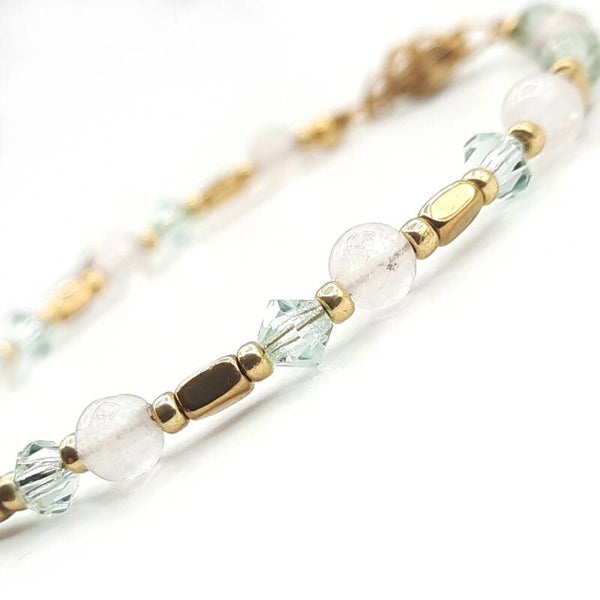 Het armbandje is gemaakt met 4 mm natuursteen kralen, Precosia glaskralen, hematite en japanse Miyuki glaskralen.