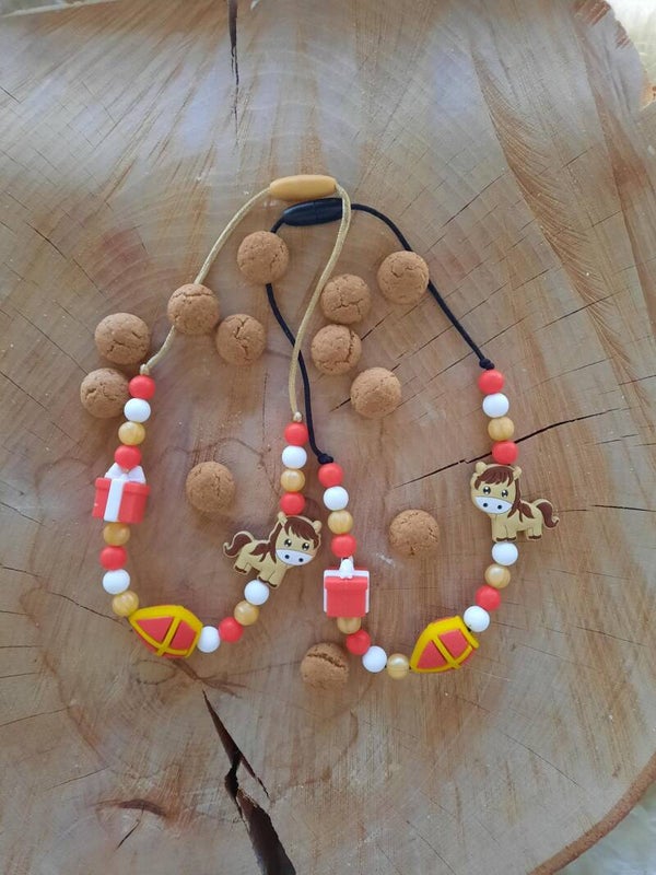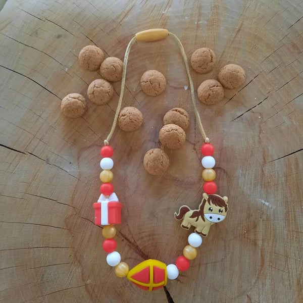 Ketting gemaakt van siliconen kralen geregen op satijnkoord en een kindervriendelijke klik sluiting.