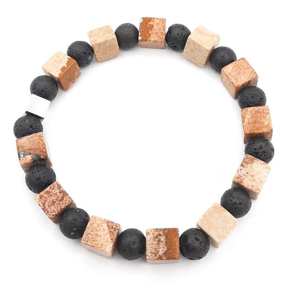 Stoere armband gemaakt van 8 mm ronde en kubus natuursteenkralen. Geregen op dubbel elastiek.