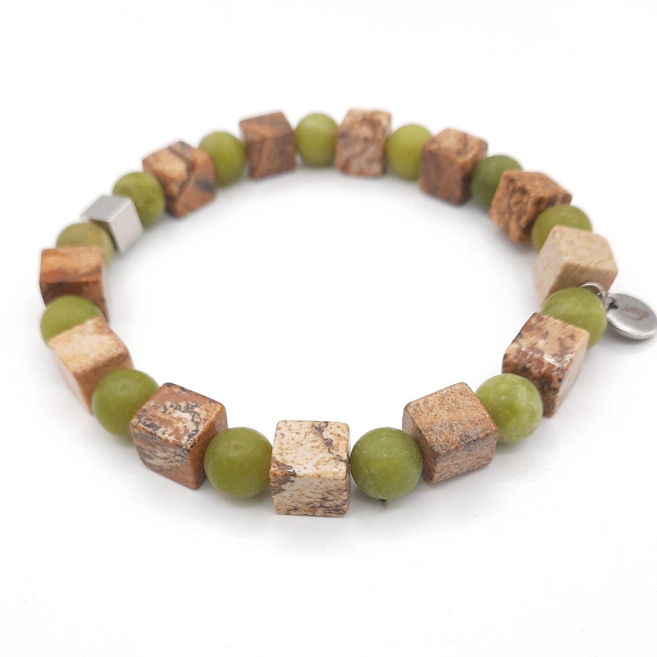 Heren armband van 8 mm ronde en kubus natuursteen kralen. Geregen op dubbel elastiek.