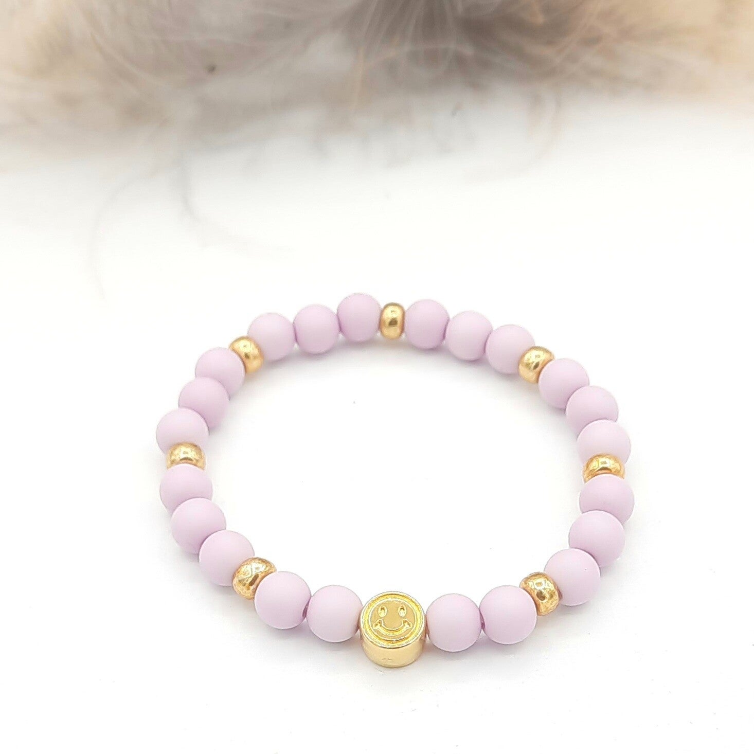 Een lief armbandje voor onze kleine fashionista´s. Gemaakt van 6 mm acrylkralen, Miyuki kralen en een goudkleurige figuurkraal. Geregen op dubbel elastiek zodat het armbandje extra stevig is.