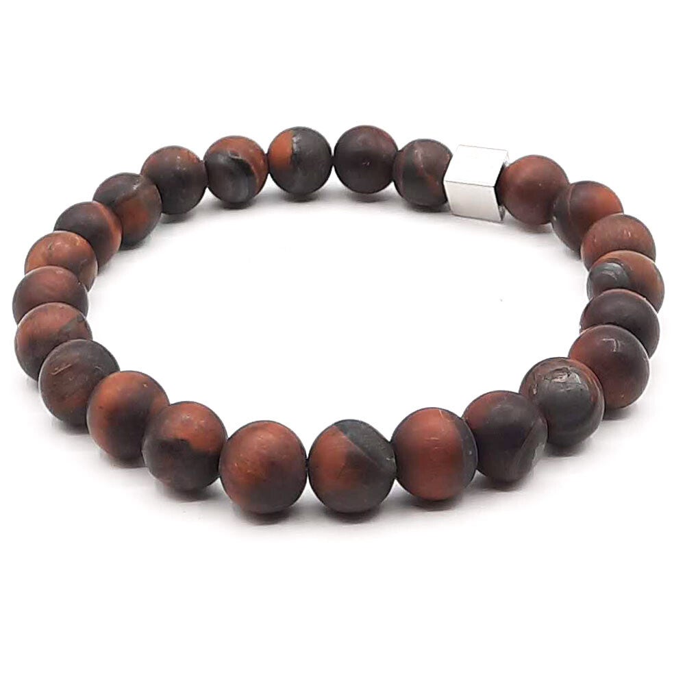 Deze armband is gemaakt van 8 mm natuursteen geregen op dubbel elastiek en afgewerkt met een rvs kraal.