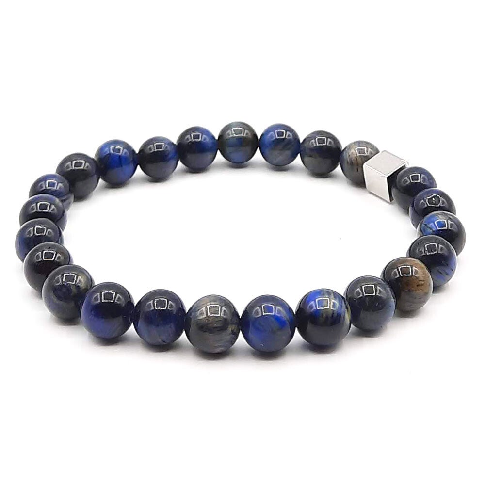 Deze armband is gemaakt van 8 mm natuursteen geregen op dubbel elastiek en afgewerkt met een rvs kraal.